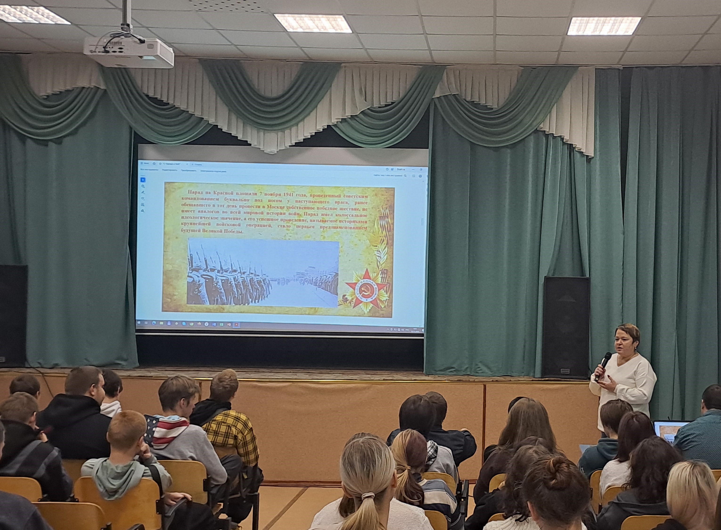 10 ноября в нашем техникуме состоялся Час Истории для обучающихся 1-3 курсов, посвященный Дню воинской славы, отмечаемому в России 7 ноября. Эта дата была установлена в 1995 году в честь Дня проведения военного парада на Красной площади в Москве в 1941 году. 7 ноября 1941 года на Красной площади в Москве состоялся военный парад в ознаменование 24 годовщины Великой Октябрьской социалистической революции. Он проводился во время битвы за Москву, когда линия фронта находилась всего в нескольких десятках километров от советской столицы. Парад имел большое историческое значение: показал высокую твёрдость духа бойцов и командиров Красной Армии и вдохновил тысячи молодых людей со всех уголков Советского Союза записаться на фронт добровольцами. О параде и Битве за