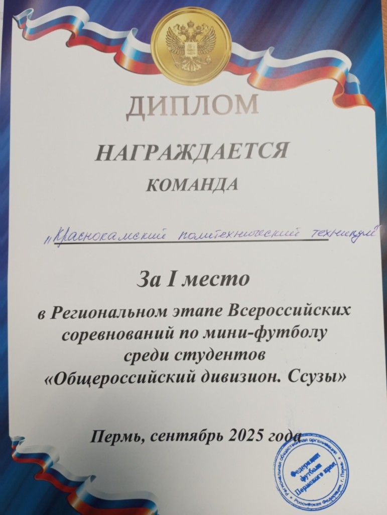 24.09.2025 года команда техникума по мини-футболу приняла участие в Региональном этапе Всероссийских соревнований по мини-футболу среди студентов «Общероссийский дивизион. Ссузы.». В соревнованиях участвовали 4 сильнейшие команды, ставшие лучшими по итогам прошлого года. В первой игре наши взяли верх над командой Кудымкарского лесотехнического техникума со счетом 3:1, во второй игре была обыграна команда Пермского радиотехнического колледжа со счётом 4:1. В результате финалистами Регионального этапа стали Пермский институт железнодорожного транспорта и Краснокамский политехнический техникум. Игра финалистов закончилась со счётом 1:1. По разнице забитых и пропущенных голов команда нашего техникума заняла первое место и завоевала путевку во Всероссийский финал среди ССУЗов, который будет проходить в г. Ессентуки Ставропольского края. Соревнования пройдут в период с 04.10.2025г. по 09.10.2025г. Поздравляем наших