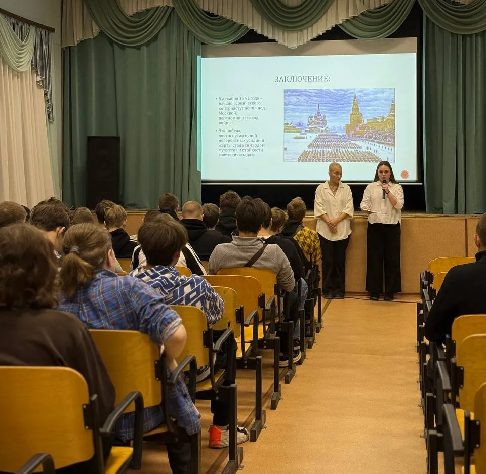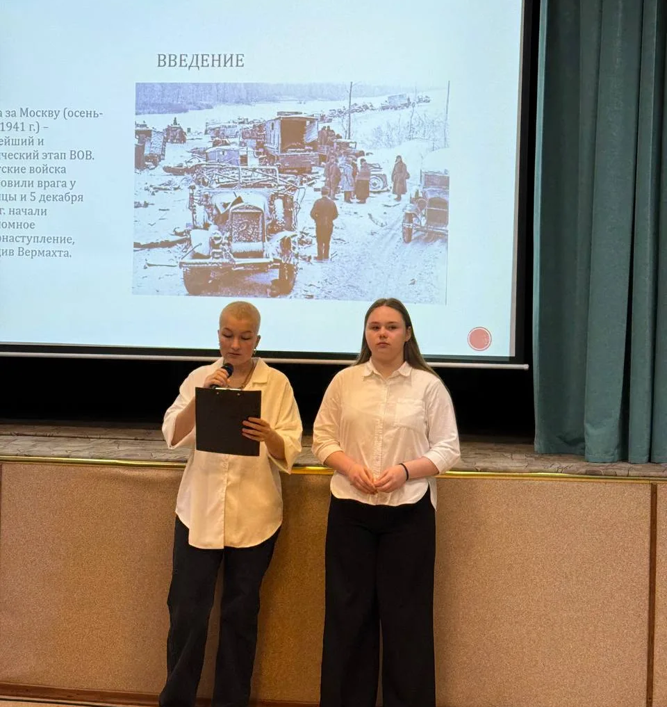 1 декабря в нашем техникуме прошел Час истории для обучающихся 1 и 2 курсов, посвящённый основным событиям битвы за Москву, происходивших с сентября 1941 г. по апрель 1942 года. Тема была выбрана неслучайно: 5 декабря в России отмечается День воинской славы - именно в этот день 84 года назад Красная Армия начала контрнаступление под Москвой по широкому фронту от Калинина (ныне – Тверь) до Ельца. Обучающиеся группы № МО-24р(в), силами которых было подготовлено мероприятие, рассказали, что в результате операции немецко-фашистские войска под Москвой были отброшены от столицы Советского Союза. Значимость такого события по-настоящему трудно переоценить, учитывая тот факт, что в критические моменты от упомянутых передовых позиций гитлеровцев до Москвы оставалось не более 20 км. За месяц боев немецкие войска были отброшены к западу примерно на 250 км. Ребята не только