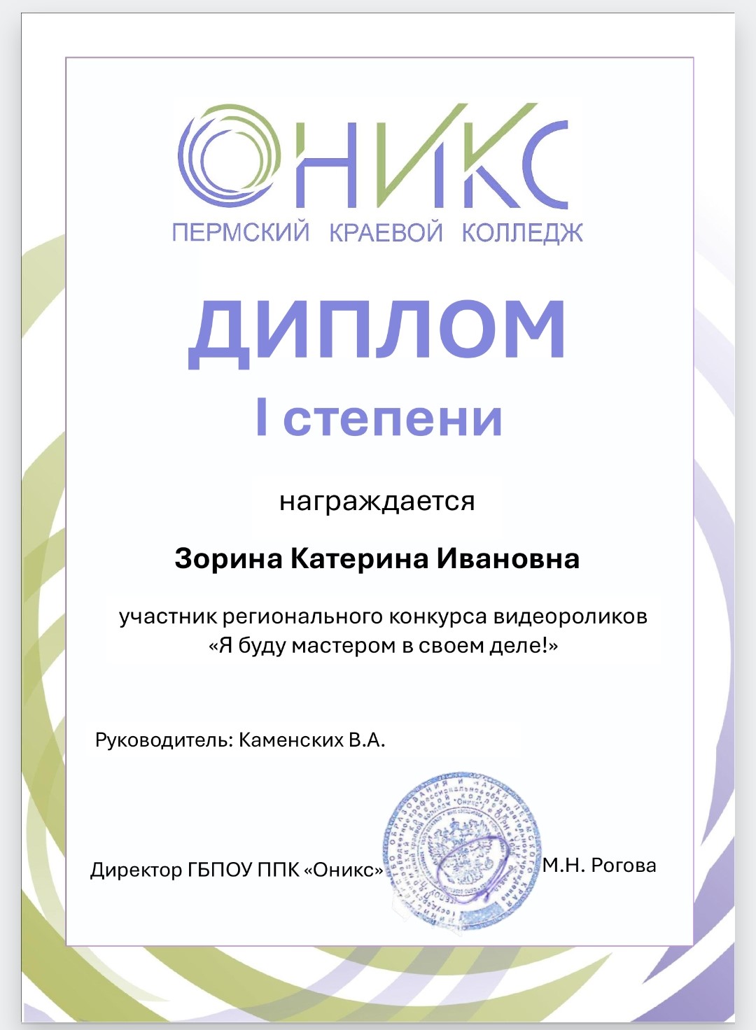 Подведены итоги открытого Регионального конкурса видеороликов «Я буду мастером в своем деле!» организованного Пермским краевым колледжем «Оникс». Конкурс проводился в рамках плана празднования 85-летия системы среднего профессионального образования в России. Его главной целью стала - популяризация рабочих профессий, повышение престижа среднего профессионального образования и интереса к обучению в образовательных организациях СПО. Зорина Катерина, обучающаяся 2 курса, группы № ПВ-24р, по профессии 12901 Кондитер, представила уникальный видеоролик, рассказывающий о своей любимой профессии. Работа Катерины набрала максимальное количество баллов и заслуженно заняла почетное первое место, благодаря креативному подходу, глубокому погружению в тему и профессиональной подаче материала. В качестве наставника