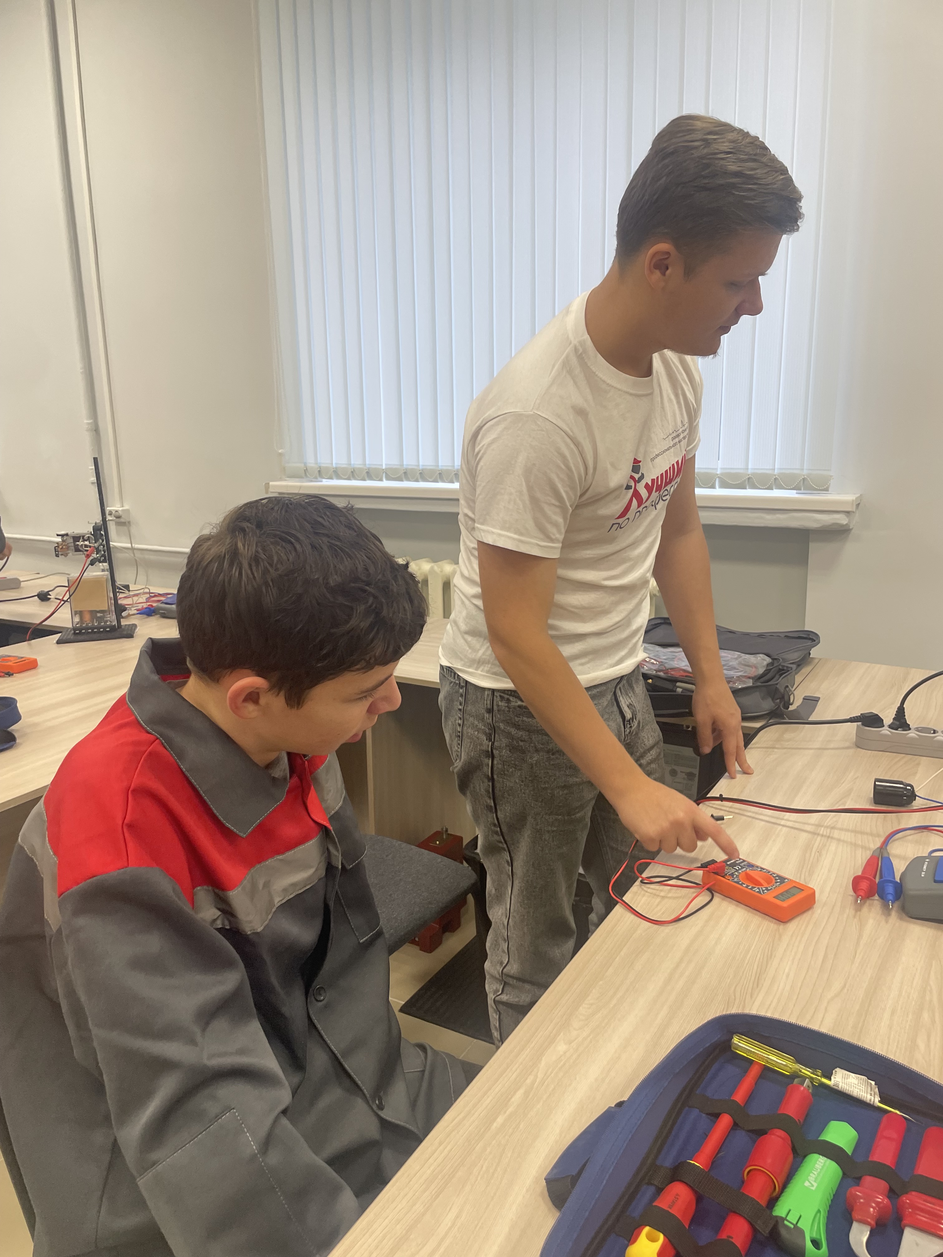 14 октября в рамках Федерального проекта «Профессионалитет» и Единого дня открытых дверей была проведена профессиональная проба для учащихся 9а класса МАОУ «Школы-гимназии № 1». В мероприятии приняло участие 15 человек. Обучающиеся группы № МЭ-22с, 4 курса, по специальности «Техническая эксплуатация и обслуживание электрического и электромеханического оборудования» под руководством преподавателя Кононовой Светланы Алексеевны выступили в качестве наставников. Они продемонстрировали приемы работы с инструментом по разделке и подключению проводников к светильнику, а также использование прибора - мультиметра для измерения величины напряжения и сопротивления, указателя напряжения для контроля наличия напряжения в сети, мегомметра для измерения сопротивления изоляции. Учащиеся под контролем и с помощью студентов охотно проводили замеры самостоятельно. Они освоили безопасные приемы работы электриков с использованием защитных средств. На базе прибора РЕТОМ