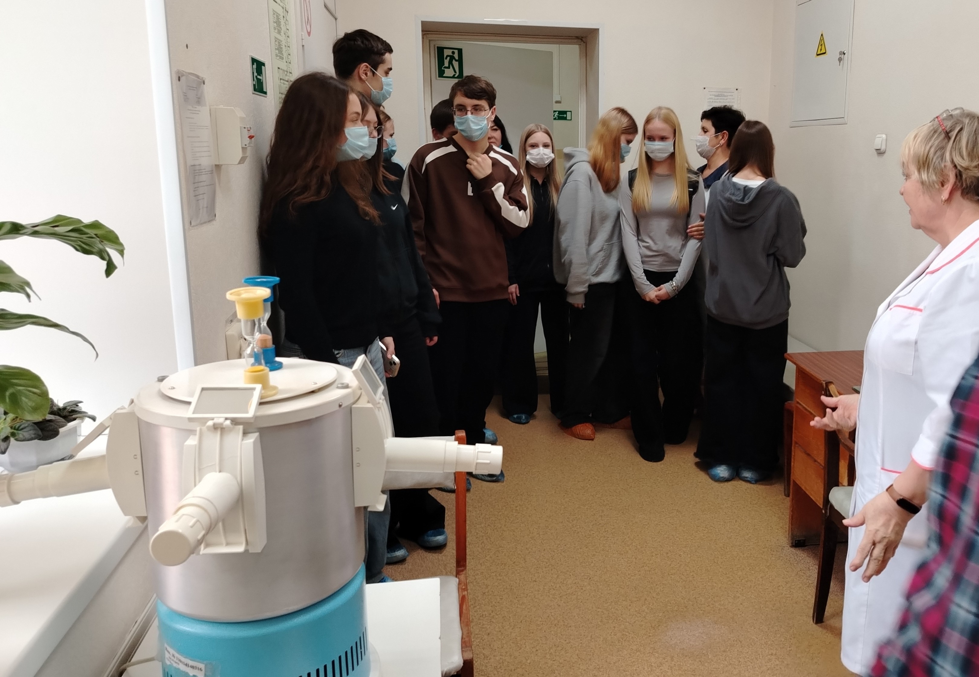 16 октября 2025 года Краснокамским политехническим техникумом была организована и проведена экскурсия для учащихся 9г класса Краснокамской общеобразовательной школы № 1 в Краснокамскую городскую больницу. Мероприятие проведено в рамках реализации ФП «Профессионалитет» и Единого дня открытых дверей (ЕДОД). В сопровождении преподавателя профессионального цикла техникума по специальности «Сестринское дело» Коноваловой Натальи Владимировны школьники посетили поликлинику №1. От школы в мероприятии приняли участие 15 школьников и 1 педагог. Старшая медицинская сестра городской больницы Голыжбина Елена Валерьевна рассказала о структуре поликлиники: регистратура, участковая служба, узкие специалисты, служба неотложной помощи, выездная бригада «Врач на дом», флюорография, отделение функциональной диагностики, физиотерапевтический кабинет, администрация. Елена Валерьевна детально рассказала о процедуре СМАД. СМАД (суточное мониторирование артериального давления) – это методика исследования, которая используется для определения уровня артериального давления у пациентов в течение длительного отрезка времени. Учащиеся познакомились с работой картотеки, рентген кабинета, кабинета флюорографии, физиотерапевтического кабинета. Специалисты поликлиники рассказали ребятам о работе флюорографа, физиотерапевтических аппаратов. Школьники с интересом наблюдали за работой медицинской аппаратуры, задавали вопросы по их функционированию, интересовались специальностью «Сестринское дело». Наталья Владимировна