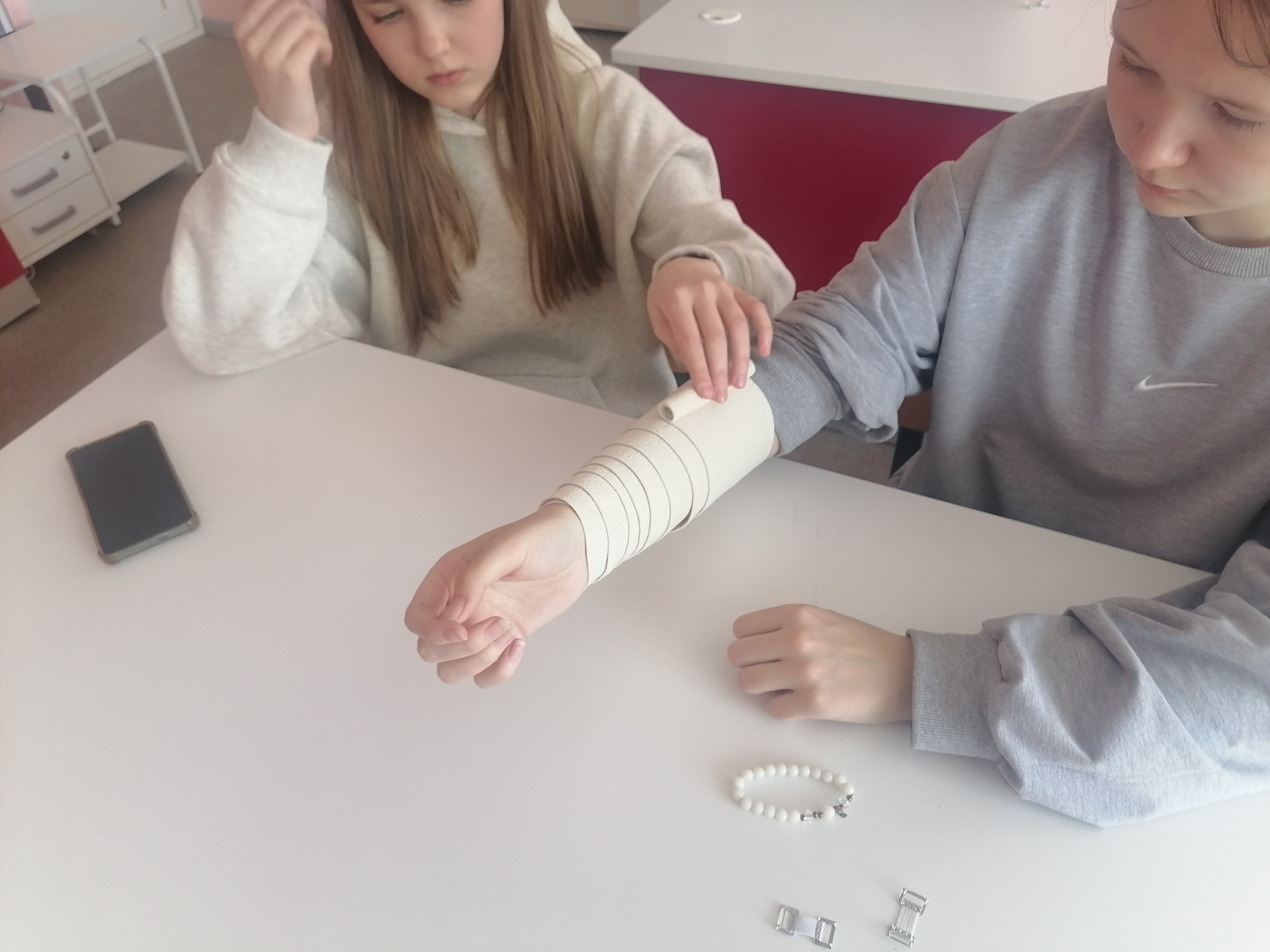 17 апреля 2026 года в рамках Единого дня открытых дверей на базе ГБПОУ «Краснокамский политехнический техникум» для школьников проведены профессиональные пробы по специальности 34.02.01 Сестринское дело. В ходе мероприятии учащиеся узнали о показаниях к наложению тугой повязки. Преподаватель специальности «Сестринское дело» рассказала участникам мероприятия о том, что компрессионная повязка на предплечье в медицинской практике применяется для остановки кровотечения, лечения травм мягких тканей, в послеоперационный период, обезболивания при воспалениях. Татьяна Сергеевна продемонстрировала технику наложения давящей повязки на предплечье и обратила внимание на противопоказания ее наложения. Далее школьники с интересом отрабатывали наложение тугой повязки друг на друге: учились правильно держать эластичный бинт, фиксировать первый тур (обмот бинтом), накладывали туры через определённые промежутки, тренировались правильно заканчивать бинтование и фиксировать повязку. В мероприятие приняли