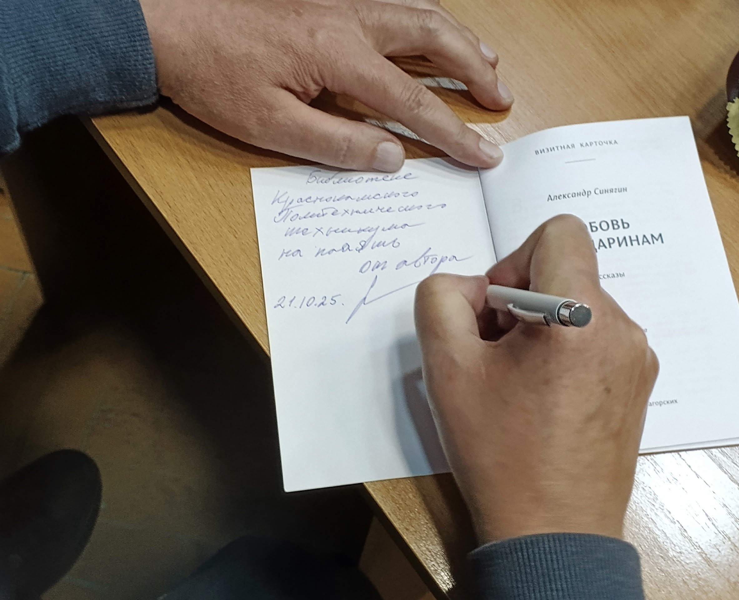 21 октября в техникуме состоялась литературная встреча - знакомство с пермскими писателями Шестаковой Галиной Евгеньевной и Синягиным Александром Германовичем. Шестакова Галина Евгеньевна – автор современной и исторической прозы. Живёт в Перми. Образование экономическое. Работала главным бухгалтером, коммерческим директором, дизайнером и скульптором, моделью. Член Союза писателей России, редактор интернет-СМИ Пермского отделения «Союз писателей России». Публиковалась в журналах «Веси», «Студия» в Берлине, в альманахе «Литературная Пермь», в журналах «Урал» и «Уральский следопыт». Изданы 2 книги: «Будьте моей тётей» и «Хрущёба № 17», основные публикации в электронном виде на «Литресс» и других интернет-платформах. Синягин Александр Германович состоит в Межрегиональном союзе краеведов, может очень интересно рассказать о том, когда построено то или иное здание в Перми, что было в нём раньше. Александр Германович – автор рассказов о жизни пермяков, о городе, о природе Пермского края. Публиковался в местных газетах и коллективных сборниках: «Великая Отечественная война в документах и воспоминаниях пермяков» 2019г., «Земля Пермская. Наша Победа 2025г», «Моя семья в истории города». В этом году вышел сборник рассказов «Любовь к мандаринам». К сожалению, Г.Е. Шестакова не смогла присутствовать на встрече, но о ней ребятам рассказали ведущие встречи. А.Г. Синягин познакомил присутствовавших с интересным направлением в краеведении: рассказал, что «Родоведение» - это создание своей родословной, знание о родственных связях и происхождении конкретных людей или истории целых родов. Посоветовал студентам подписывать фотографии, особенно коллективные, так как с ходом времени забываются подробности. И прочитал свои рассказы из сборника «Любовь к Мандаринам». Сборник состоит из обычных историй про необычные моменты жизни, где есть место юмору, драме, ностальгии и неожиданным поворотам. Герои Александра Синягина — простые люди, но их поступки, страхи и мечты делают их невероятно близкими читателю. Автор сделал подарок для библиотеки техникума – свой сборник «Любовь к мандаринам» и энциклопедию «Пермский край в Великой Отечественной войне», которые можно использовать для проведения «Разговоров о важном» и классных часов. Встреча прошла