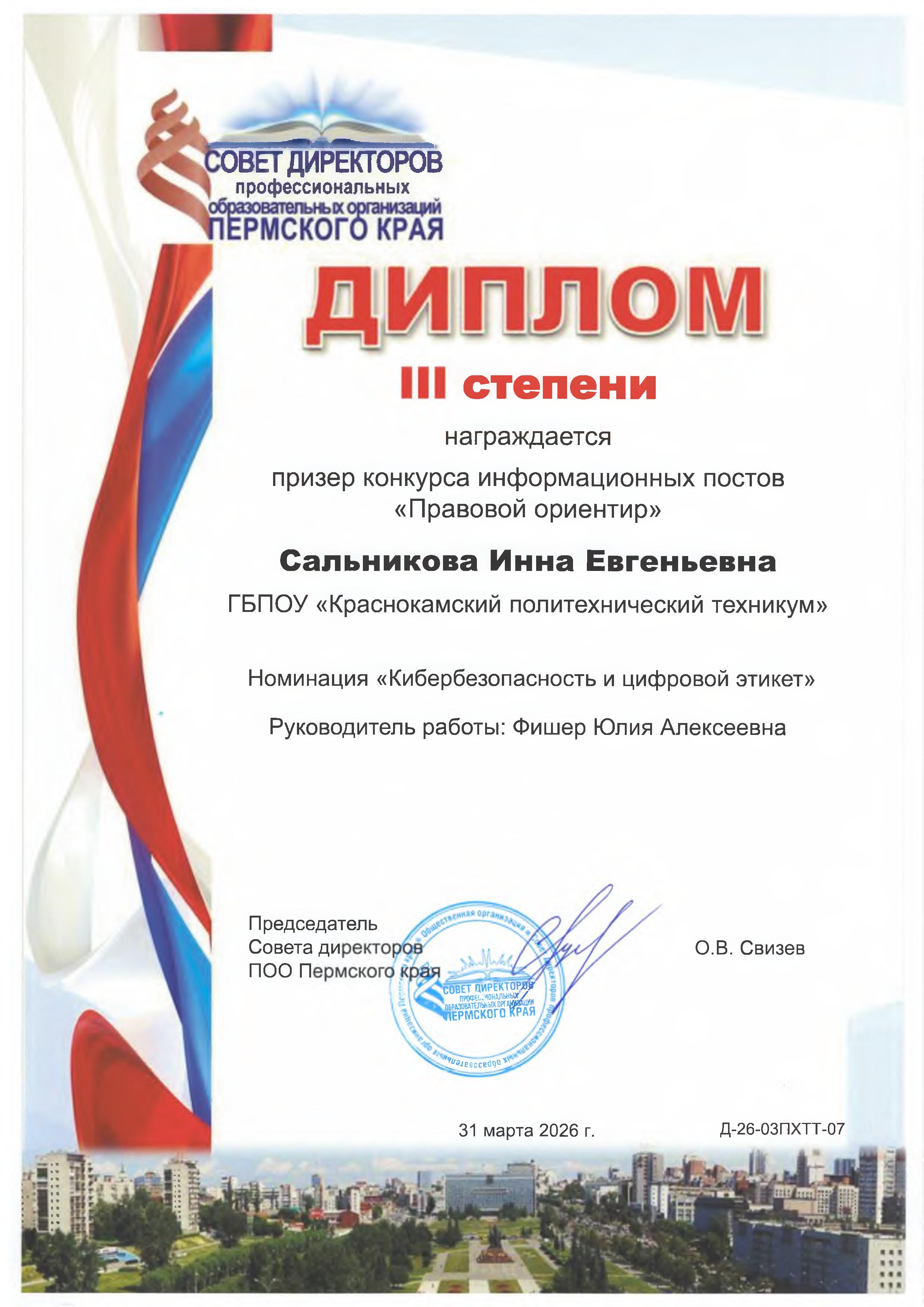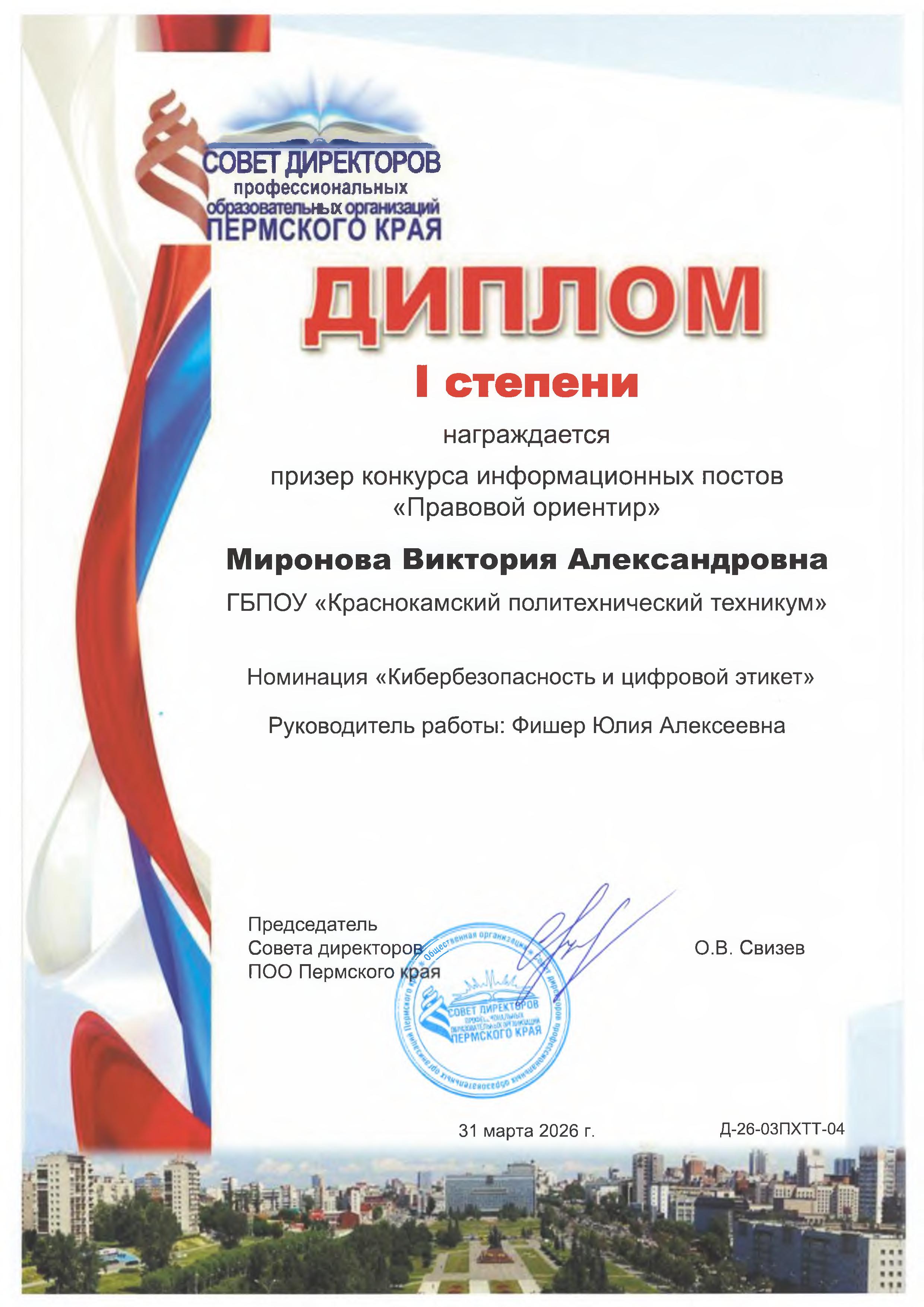 Обучающиеся 4 курса, группы ПК-22р Миронова Виктория, Ромина Валерия, Якимова Валерия, Сальникова Инна под руководством преподавателя Фишер Юлии Алексеевны с 27.02.2026 г. по 31.03.2026 г. принимали участие в Краевом конкурсе информационных постов «Правовой ориентир», целью которого является повышение уровня правовой культуры молодежи и формирование устойчивого интереса к правовым знаниям через вовлечение в творческую контент-деятельность. От нашего техникума были представлены следующие работы: видеоролик в номинации «ЗОЖ и отказ от вредных привычек», а так же макет информационного поста в номинации «Кибербезопасность и цифровой этикет». Наши студенты Миронова Виктория заняла 1 место, Сальников Инна – 3 место! Поздравляем и желаем дальнейших творческих побед! |