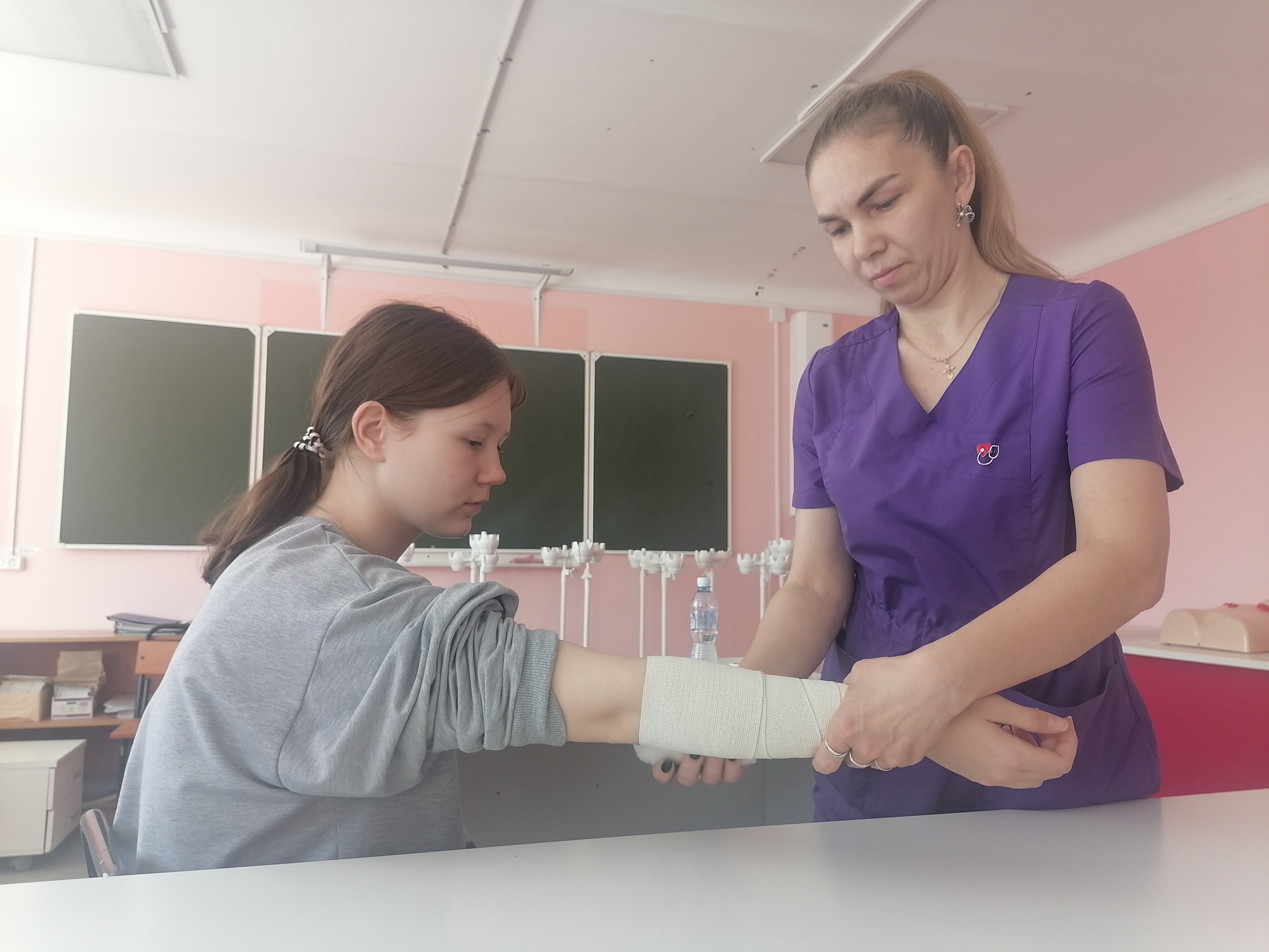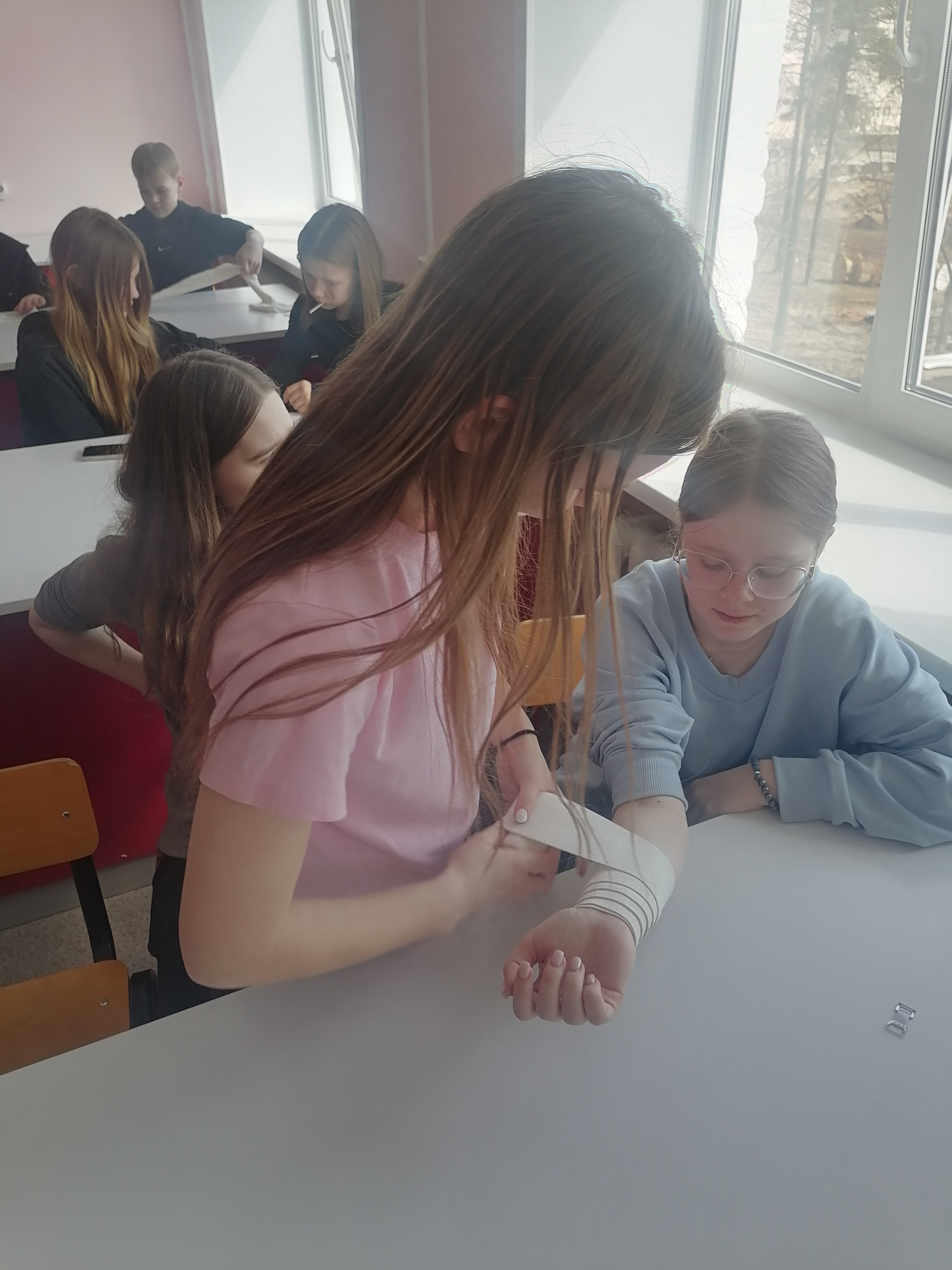 17 апреля 2026 года в рамках Единого дня открытых дверей на базе ГБПОУ «Краснокамский политехнический техникум» для школьников проведены профессиональные пробы по специальности 34.02.01 Сестринское дело. В ходе мероприятии учащиеся узнали о показаниях к наложению тугой повязки. Преподаватель специальности «Сестринское дело» рассказала участникам мероприятия о том, что компрессионная повязка на предплечье в медицинской практике применяется для остановки кровотечения, лечения травм мягких тканей, в послеоперационный период, обезболивания при воспалениях. Татьяна Сергеевна продемонстрировала технику наложения давящей повязки на предплечье и обратила внимание на противопоказания ее наложения. Далее школьники с интересом отрабатывали наложение тугой повязки друг на друге: учились правильно держать эластичный бинт, фиксировать первый тур (обмот бинтом), накладывали туры через определённые промежутки, тренировались правильно заканчивать бинтование и фиксировать повязку. В мероприятие приняли